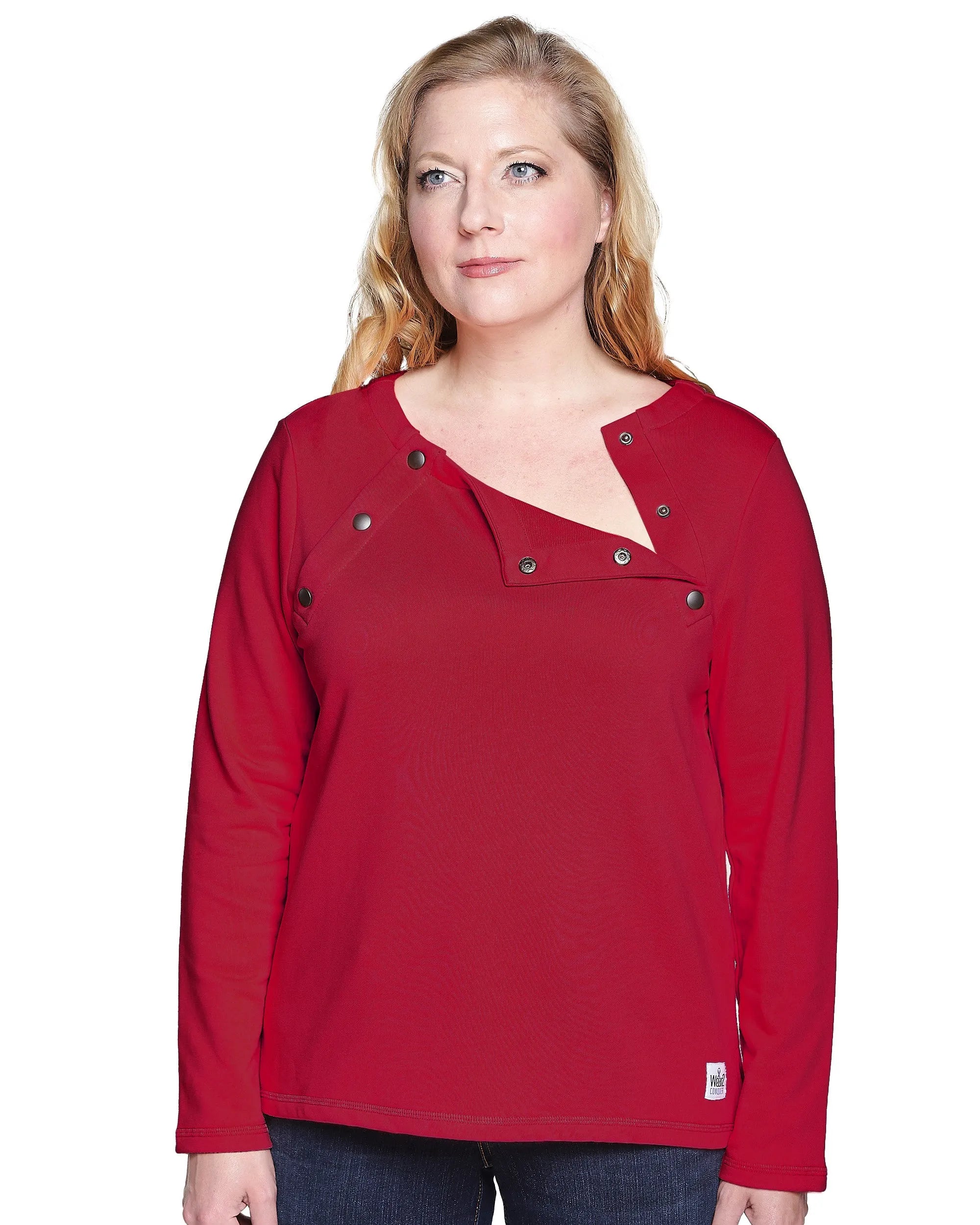 This ruby red adaptive top features dual snap openings near each collarbone, offering easy, discreet access to chest ports or central lines without the need to remove your clothing or wear a hospital gown.